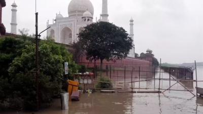 यमुना का जलस्तर बढ़ा: ताजमहल परिसर में टिकट विंडो से बाग तक बाढ़ का पानी भर गया