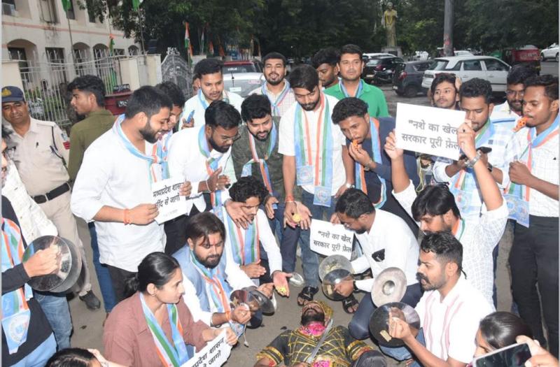 भोपाल। राजधानी भोपाल में उजागर हुई अवैध ड्रग्स फैक्ट्री ने पूरे प्रदेश को चौंका दिया है। डीआरआई की कार्रवाई में करोड़ों रुपए की मेफेड्रोन (MD) ड्रग्स और भारी मात्रा में कच्चा माल बरामद हुआ। इस मामले में कांग्रेस की छात्र इकाई NSUI ने बुधवार को भोपाल में आनोख विरोध प्रदर्शन किया। एक कार्यकर्ता कुंभकरण बन कर लेट गया और दूसरे कार्यकर्ता उसे जगाते रहे। इस दौरान कार्यकर्ताओं ने आरोप लगाया कि प्रदेश सरकार की आंखों के सामने नशे का व्यापार फलता-फूलता रहा और शासन कुंभकरण की नींद सोता रहा। आज उसे ही जगाने की कोशिश की जा रही है।