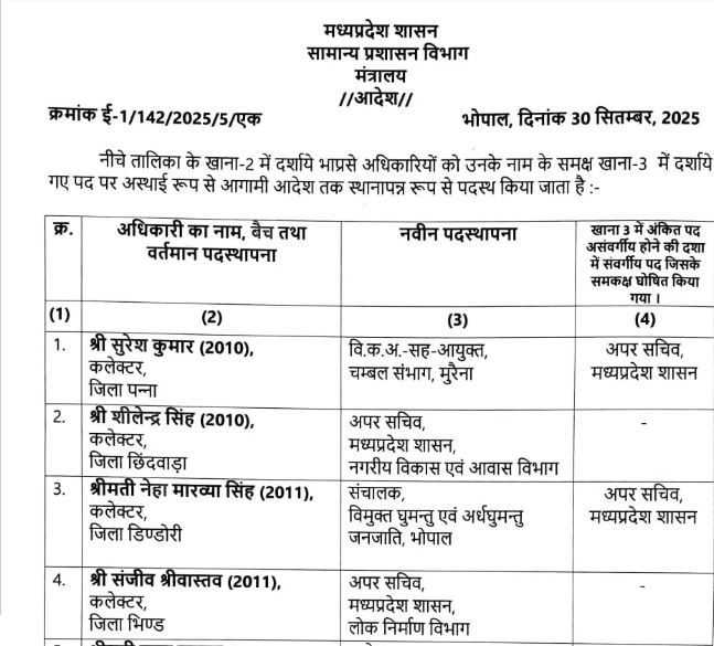 मध्य प्रदेश में बड़ा प्रशासनिक फेरबदल, 24 IAS अधिकारियों के तबादले की सूची जारी