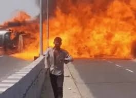 नेशनल हाईवे पर तेल टैंकर पलटा, 200 मीटर तक फैली भीषण आग