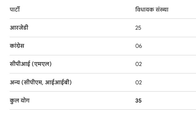 • महागठबंधन (विपक्ष): कुल विधायकों की संख्या महज 35 है।