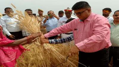 अकबरपुर तहसील में डीएम ने खेत में गेहूं की फसल की हसिया से कटाई की