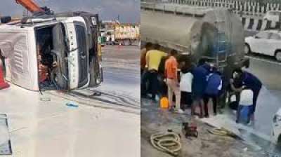 मेरठ एक्सप्रेस वे पर टैंकर-ट्रक की टक्कर पड़ी रही ड्राइवर की लाश और दूध लूटते रहे लोग