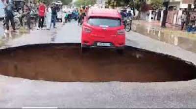 लखनऊ में बीच सड़क मिट्टी धंसने से हुआ 7 मीटर लंबा और 5 मीटर गहरा गड्ढा!
