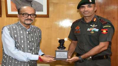 रायपुर: राज्यपाल श्री रमेन डेका से आज यहां राजभवन में 155 इन्फैंट्री बटालियन जम्मू-कश्मीर राइफल्स (छत्तीसगढ़ टेरियर्स) नवा रायपुर के कमाडिंग ऑफिसर कर्नल राज कुमार ने सौजन्य भेंट की।