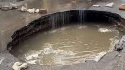 बारिश में हुआ सड़क पर 15 फीट का गड्ढा