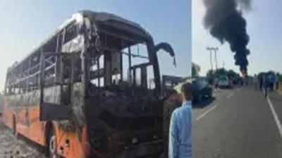 जैसलमेर में चलती निजी बस में भीषण आग, कई यात्री झुलसे।