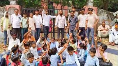 जर्जर स्कूल भवन के विरोध में ग्रामीणों संग बच्चों ने किया प्रदर्शन, स्कूल गेट पर जड़ा ताला